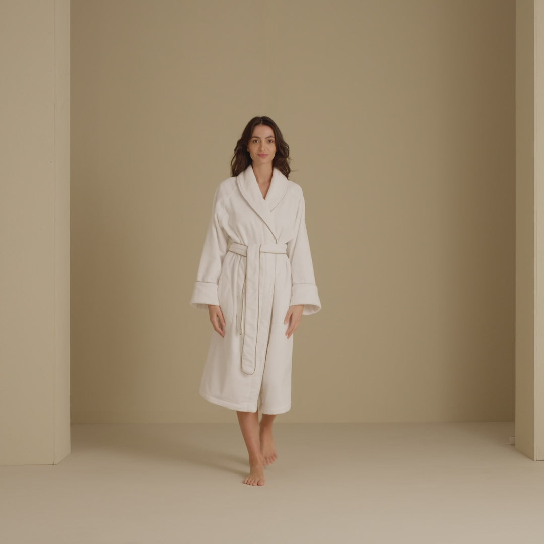 Этот роскошный халат в континентальном стиле изготовлен из чистого пушистого хлопка с тонкой каймой из контрастной окантовки.